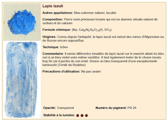 Du bleu, il est question aussi dans le film. A l'épisode 3, La Passion selon Andreï, le peintre et son jeune apprenti Foma cheminent vers Théophane le Grec. Or Foma est "préoccupé, dit la notice Wikipedia, par les aspects pratiques du travail, comment perfectionner le bleu azur, une couleur instable." Ce bleu très onéreux à produire était obtenu à partir de la pierre de lapis lazuli. La description suivante donne comme référence la Trinité de Roublev :
