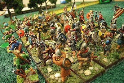 Here are some photos of two Hail Caesar games we played Tuesday of last week. The first game involved two forces of Vikings attacking a bunch of Saxons on a ridge. On turn one half the Vikings blundered and retreated and the other half of the Vikings disgusted with their cousins set about winning the battle by themselves. The Saxons obliged by coming down from the ridge and a nasty brawl began. Eventually the Vikings prevailed over the Saxons and when the other half of the Viking army finally managed to organize itself enough to join the fray it was pretty well curtains for the Saxons. The second game was a head on clash between two Norman Counts. The knights, being knights went straight for each other and a very nasty fight began. At first it looked as if the knights of Count Rollo were going to sweep the field but then the knights of Ofa their erstwhile opponents pulled themselves together and managed to hold their ground. When the infantry of Rollo collapsed in a heap after fighting the infantry of Ofa it was all pretty well over for Rollo and he conceded the field. In all we played for about three hours, the games were great fun and flowed along without a hitch.